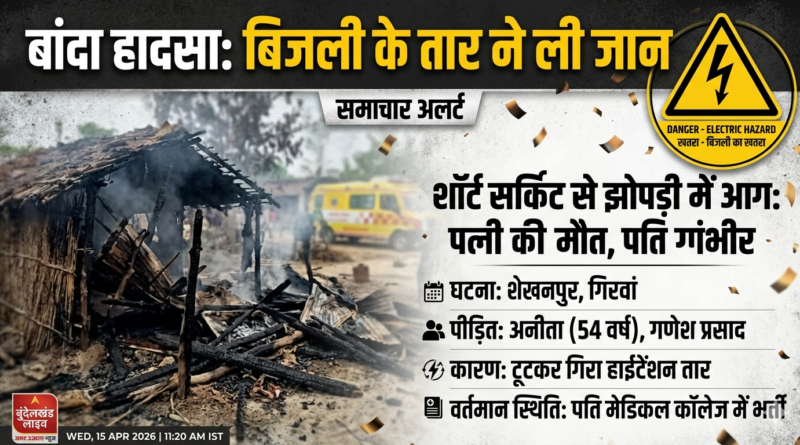 Banda News Update: उत्तर प्रदेश के बांदा जिले से एक ह्रदय विदारक घटना सामने आई है। गिरवां थाना क्षेत्र के शेखनपुर गांव में बीती रात बिजली का हाईटेंशन तार टूटकर एक झोपड़ी पर गिर गया। इस हादसे ने एक हंसते-खेलते परिवार को उजाड़ दिया। आग की चपेट में आने से एक बुजुर्ग महिला की मौके पर ही दर्दनाक मौत हो गई, जबकि उसके पति जीवन और मौत के बीच संघर्ष कर रहे हैं।