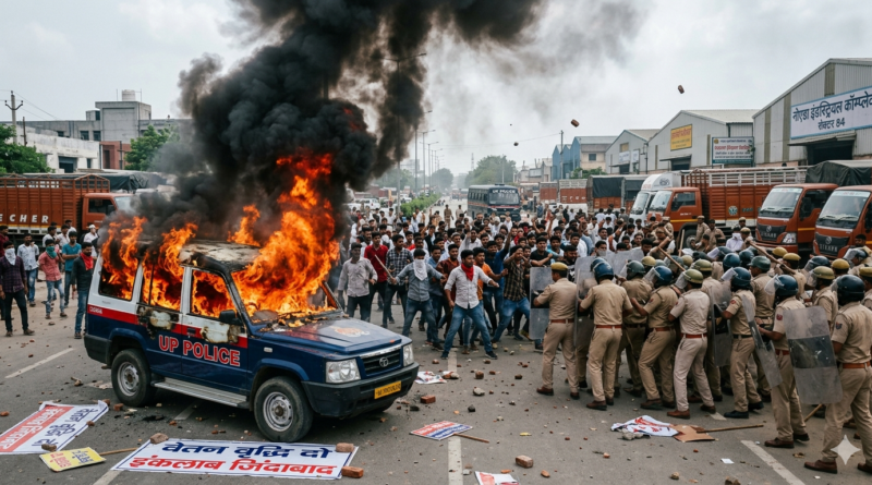 नोएडा दहला: वेतन वृद्धि की मांग पर हिंसक हुए कर्मचारी, पुलिस की गाड़ी फूंकी, NH-9 जाम; भारी पुलिस बल तैनात
